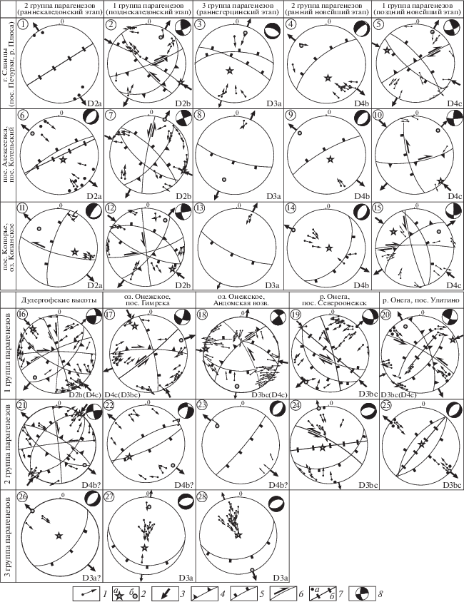 Равноплощадные стереографические проекции (нижняя полусфера) полюсов разрывов с векторами перемещения висячего крыла для структур различных этапов деформаций D2a–D4c. 1 – полюса плоскостей разрывов и векторы перемещений висячего крыла; 2 – положение главных осей палеонапряжений: а – сжатия, б – растяжения; 3 – проекции главных осей деформации на горизонтальную плоскость; 4–7 – усредненные позиции плоскостей нарушений: 4 – взбросов и надвигов, 5 – сбросов, 6 – сдвигов, 7 – трещин отрыва и нептунических даек: а – полюса плоскостей, б – плоскости; 8 – министереограммы палеонапряжений, квадранты: растяжения (черный), сжатия (белый)