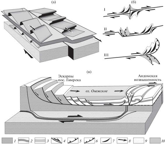 Графические модели проявления деформаций в зонах сдвига. (а) – модель сдвиговых смещений в породах фундамента с их трансформацией в малоамплитудные разрывы в слоистой толще чехла, совмещенные с системами диагональных складок и надвигов, которые сопряжены с субслойными срывами; (б) – модели (вид в плане): I – локализации складчато-разрывных структур на участках изгиба сдвиговой зоны, II ‒ двух смежных изгибов ее магистрали, III – в области виргации нарушения; (в) – объемная модель соотношений структурных ансамблей в Южно-Онежском сегменте смежных изгибов магистрали Балтийско-Мезенской зоны сдвига. 1–2 – комплексы: 1 – фундамента, 2 – чехла; 3 – водоемы; 4–6 – разрывы: 4 – сдвиги, 5 – взбросы и надвиги, 6 – сбросы; 7 – антиклинали; 8 – направления перемещений; 9 – поднятия; 10 – депрессии