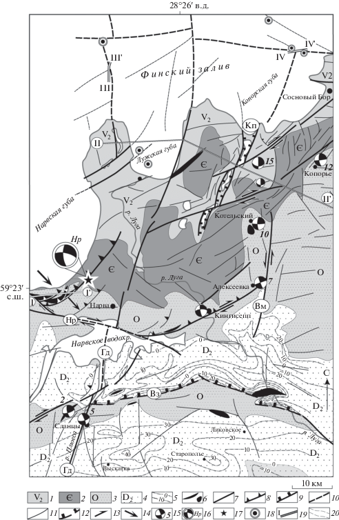 Геолого-структурная схема Лужского сегмента (с использованием данных [8, 10]). Зоны нарушений: Гд – Гдовская, Нр – Нарвская, Вз – Везенбергская, Вм – Веймарнская, Кп – Копанская. 1–4 – осадочные отложения чехла: 1 – верхнего венда, 2 – кембрия, 3 – ордовика, 4 – среднего девона; 5 – изогипсы поверхности кровли ордовика; 6 – тектонические валы и поднятия; 7–12 – разрывы: 7 – преимущественно сдвиги, 8 – взбросы и надвиги, 9 – сбросы, 10 – в акватории, 11 – второстепенные, 12 – Везенбергский уступ (сброс); 13‒14 – направления смещений: 13 – сдвиговых, 14 – тангенциальных; 15 – стереограммы палеонапряжений главного структурно-кинематического парагенеза, квадранты: растяжения (черный), сжатия (белый) и номера пунктов наблюдений; 16 – решение сейсмофокального механизма для Нарвского (Нр) землетрясения; 17 – эпицентры землетрясений; 18 – поля проявления пок-маков; 19 – линии разрезов; 20 – изобаты