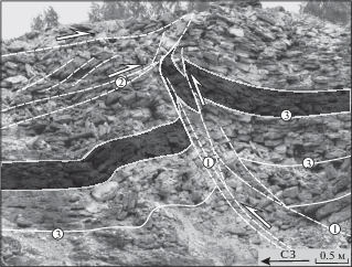 На основании геометрического анализа слоистости установлены складки двух главных генераций, осевые плоскости которых имеют северо-восточную и северо-западную ориентировку (см. рис. 8, стереограмма I). Антиклинали северо-восточного простирания резко преобладают. Они имеют асимметричное строение и связаны с развитием сдвиго-взбросов, срезающих их крутые крылья (см. рис. 8, а). Общая вергентность складчато-разрывных структур направлена на юго-восток или северо-запад. В области Кирхгофской антиклинали отмечается дивергенция, соответствующая положительной структуре цветка (см. рис. 8, а).