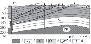 Геологический разрез по линии I–I', пересекающий систему нарушений Вайварской возвышенности. Показан: Нр – Нарвский разлом. 1 – палеопротерозойские комплексы фундамента; 2–4 – отложения чехла: 2 – верхнего венда, 3 – кембрия, 4 – ордовика; 5 – разрывы и направления смещений; 6 – скважины