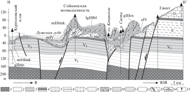 Геологический разрез по линии II–II’ в районе Лужской губы и оз. Копанское (с использованием данных [10]). 1 – палеопротерозойские комплексы фундамента; 2–3 – отложения верхнего венда: 2 – преимущественно песчаники, 3 – песчано-глинистые отложения, 4–5 – отложения кембрия: 4 – песчаники, 5 – преимущественно глины; 6 – терригенно-карбонатные отложения ордовика; 7–10 – отложения квартера: 7 – московские моренные (gIIms), 8 – микулинские межледниковые (mIIImk), 9 – осташковские моренные (gIIIos), 10 – осташковские флювиогляциальные (lgIII); 11 – гляциолимний Балтийского озера (lgIIIbl), 12 – голоценовые аллювиальные (aIV); 13 – разрывы и направления смещений; 14 – предполагаемые поверхности перемещения ледника; 15 – скважины