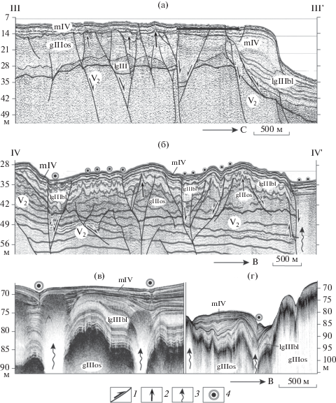 Интерпретация профилей высокочастотного сейсмопрофилирования в акватории Финского залива (с использованием данных [17, 18]). (а) – сейсмопрофиль по линии III–III' в районе подводного уступа, расположенного к северо-западу от Лужской губы; (б) – сейсмопрофиль по линии IV–IV' в районе Копороской губы; (в)–(г) – сейсмопрофили в районе о. Гогланд и одноименного разлома. 1 – разрывы и направления смещений; 2 – направления вертикальных перемещений; 3–4 – структуры пок-маков: 3 – восходящие потоки газогидратов, 4 – воронкообразные структуры на современной поверхности морского дна