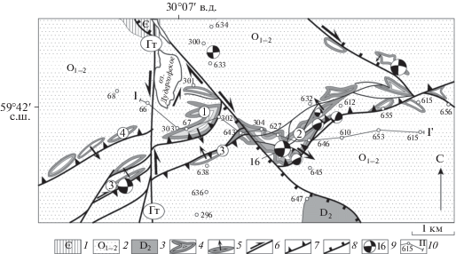 Территория участка охватывает область пересечения системы складчато-разрывных нарушений Балтийско-Мезенской зоны, имеющих субширотное и восток–северо-восточное простирание, с субмеридиональными разломами Гдовской системы (рис. 2). Отложения ордовика и среднего девона образуют обширные плато, ограниченные с севера по внешнему контуру выходов ордовикских толщ Ордовикским глинтом. Отложения верхнего венда и кембрия слагают приглинтовую низменность и дно акватории Финского залива. Покров четвертичных отложений развит почти повсеместно. Его мощность меняется от 0.2 м (область глинта, ордовикское плато) до 30–150 м (приглинтовая низина). Отложения чехла и поверхность фундамента в целом полого (9–10′) погружаются к юго-востоку [10].