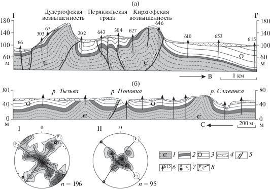 Геолого-структурные профили Дудергофской возвышенности (а) и к югу от г. Павловск (б), (с использованием данных [15, 29, 30]). Равноплощадные стереографические проекции полюсов слоистости (нижняя полусфера): I – Дудергофская возвышенность (n = 196, изолинии – 1/2/3/4/5/5, 4/6%), II – к югу от г. Павловск (n = 95, изолинии – 2/4/6/9/12/17%). 1–4 – отложения: 1 – кембрия, 2 – кембрия‒ордовика, 3 – ордовика, 4 – квартера; 5 – разрывы и направления смещений; 6 – опорные скважины; 7–8 – структурные элементы на стереограммах: 7 – шарниры складок, найденные: а – геометрически, б – по замерам в обнажениях, 8 – осевые плоскости складок F1, F2