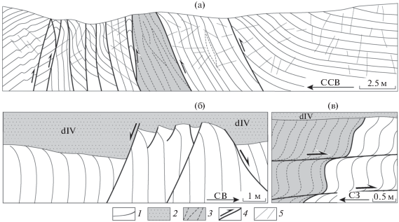 Магистральные разломы, расположенные в окрестностях г. Сланцы, г. Кингисепп и пос. Алексеевка, контролируют крупные коленообразные изгибы русел рек и хорошо выражены в рельефе (см. рис. 2, пункты 2, 7). Они сопровождаются системой оперяющих диагональных сдвиго-взбросов и надвигов, ориентированных под острым (5°–40°) углом к магистралям. С этими диагональными нарушениями связаны мелкие, часто асимметричные приразрывные складки и флексуры (рис. 3). Пликативные структуры имеют северо-западную и северную вергентность, а также обратную – южную и юго-восточную, отчасти согласованную с движением ледника. Контрвергентные к перемещению ледника структуры иногда осложнены встречными полого-надвиговыми гляциодислокациями, которые проникают на глубину 1–2 м и представлены черепичным торошением фрагментов плитчатых слоев (см. рис. 3). Разрывно-складчатые структуры переменной вергентности по морфологическим признакам сопоставимы с каледонским ансамблем структур [48, 52] и отличаются от гляционарушений более крутыми залеганиями разрывов и морфологией складок. Проявление диагональных структур в противоположных бортах магистральных сдвигов, вероятно, является причиной их дивергентности.