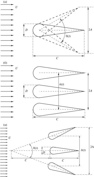Рассматривается симметричный профиль с полукруглой передней кромкой и клиновидной задней кромкой. Отношение толщины твердого профиля к длине хорды D/C = 1/6. Угловые, вертикальные и смешанные (вертикально-угловые) колебания, совершаемые профилем, представлены на рис. 1. Угловые колебания профиля описываются уравнением