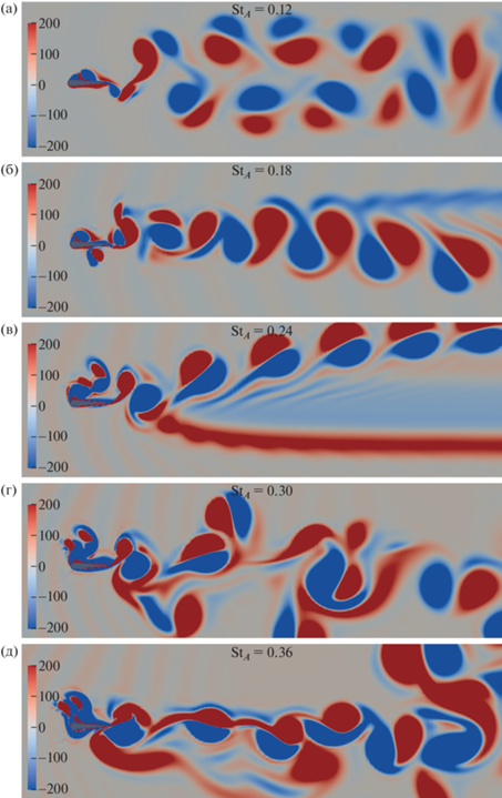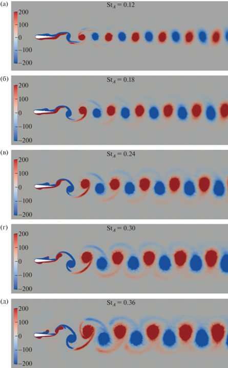 Структура следа визуализирована при помощи линий постоянных значений z – компоненты завихренности $\left( {{{\omega }_{z}}} \right)$. Сила, действующая на машущий профиль, зависит от структуры следа. Для профиля, совершающего угловые колебания при различных значениях StA, эта структура представлена на рис. 10. Красный цвет соответствует положительным значениям ${{\omega }_{z}}$, т.е. вращению против часовой стрелки, а синий цвет отрицательным значениям ${{\omega }_{z}}$(вращению по часовой стрелке). Распределения завихренности в поле течения, полученные в численных расчетах, позволяют идентифицировать структуру следа. Мгновенные изображения полей завихренности используются для того, чтобы представить расположение вихрей в следе. Классификация структур течений в следе проводится на основании направления завихренности, которое обеспечивает визуальное представление о расположении вихревой дорожки. Этот способ классификации может быть затруднителен в переходной области между прямой и обратной дорожками Кармана. В данной работе идентификация вихревой дорожки в переходной области осуществляется путем расчета завихренности в ядрах вихрей и ее сопоставлением со структурой следа по [35]. При StA = 0.12 вихри, образовавшиеся над и под профилем, выстраиваются вдоль линии симметрии (рис. 10а); такое их расположение называется нейтральным следом [36]. С ростом StA структура следа меняется, как показано на рис. 10б. Вихри, образовавшиеся над профилем, смещаются вниз от линии симметрии и наоборот. Это расположение напоминает вихревую дорожку Кармана, но с противоположным направлением завихренности, и называется обратным следом Кармана. Дальнейшее увеличение StA приводит к росту вихрей, тогда как их расположение в следе остается неизменным. Увеличение параметра махания делает вихри более интенсивными.