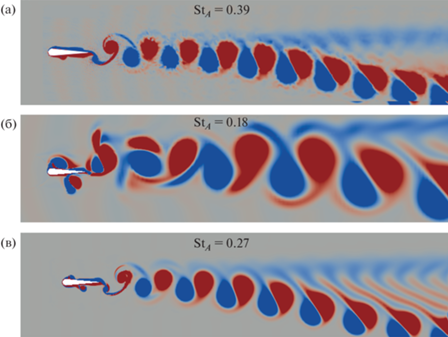Структура следа за профилем, совершающим смешанные колебания при различных значенях StA, представлена на рис. 12. Обратное кармановское расположение в следе наблюдается при StA = 0.12 (рис. 12а). С ростом StA вихри увеличиваются в размерах (рис. 12б и 12в). Вихри у передней кромки отделяются от профиля, медленно движутся к задней кромке и сливаются с вихрями, образовавшимися у задней кромки, образуя обратную дорожку Кармана. Дальнейшее увеличение StA до 0.30 изменяет поведение вихрей у передней кромки. Вихри, образовавшиеся у передней кромки, вместо того чтобы слиться с вихрями у задней кромки, эжектируются в поток и со временем диффундируют в нем. Увеличение StA до 0.36 приводит к росту размеров вихрей у передней кромки и им требуется больше времени, чтобы диффундировать в потоке. Вихри передней кромки, сравнительно небольшие в размерах, располагаются по обе стороны от вихревой дорожки, образованной вихрями с задней кромки. Вихри задней кромки деформируют вихри с передней кромки вскоре после их эжекции в поток, тем увеличивая их диффузию и способствуя установлению обратной дорожки Кармана.