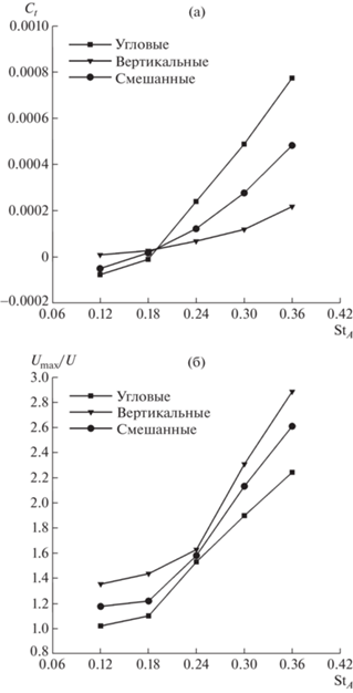 Зависимость коэффициента тяги $\left( {{{C}_{t}}} \right)$ (а) и отношения ${{U}_{{max}}}{\text{/}}{{U}_{0}}$ (б) от числа Струхаля StA, вычисленного по амплитуде.