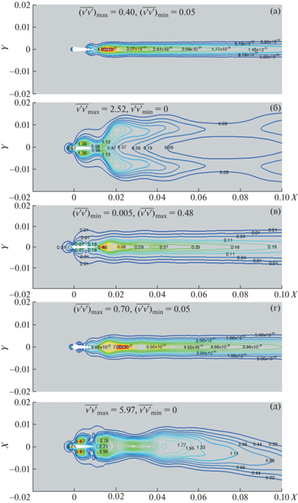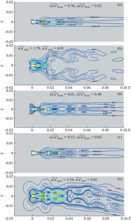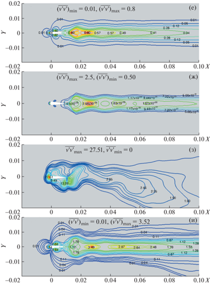 Величина $\overline {u{\kern 1pt} 'u{\kern 1pt} '} $ растет с увеличением $S{{t}_{A}}$ (рис. 15г–15е). Малые изменения $S{{t}_{A}}$ приводят к значительным изменениям в поле $\overline {u{\kern 1pt} 'u{\kern 1pt} '} $. При этом рост величины $\overline {u{\kern 1pt} 'u{\kern 1pt} '} $ с ростом $S{{t}_{A}}$ имеет один и тот же порядок для машущих колебаний всех типов. Пиковые значения $\overline {u{\kern 1pt} 'u{\kern 1pt} '} $ достигаются на пути распространения вихря. Пиковые значения $\overline {u{\kern 1pt} 'u{\kern 1pt} '} $ по обеим сторонам от линии симметрии указывают на вращение жидкости относительно среднего течения [41]. Величина $\overline {u{\kern 1pt} 'u{\kern 1pt} '} $ близка к нулю вдоль линии симметрии, так как вдоль этой линии вихрь не распространяется. Изолинии $\overline {u{\kern 1pt} 'u{\kern 1pt} '} $ для профиля, совершающего вертикальные колебания, отклоняются в дальнем следе (рис. 15д) подобно изолиниям завихренности (рис. 11б). Однако в следе за профилем, совершающим угловые (рис. 15г) и смешанные (рис. 15е) колебания, отклонение не наблюдается. Дальнейшее увеличение $S{{t}_{A}}$ до $0.36$ приводит к динамическому росту велиичны $\overline {u{\kern 1pt} 'u{\kern 1pt} '} $ в случае вертикальных движений (рис. 15з) по сравнению с машущими движениями других типов (рис. 15ж и 15и). Отклонение следа за вертикально колеблющимся профилем при $S{{t}_{A}} = 0.36$ (рис. 15з) указывает на апериодичность, развивающуюся в потоке.