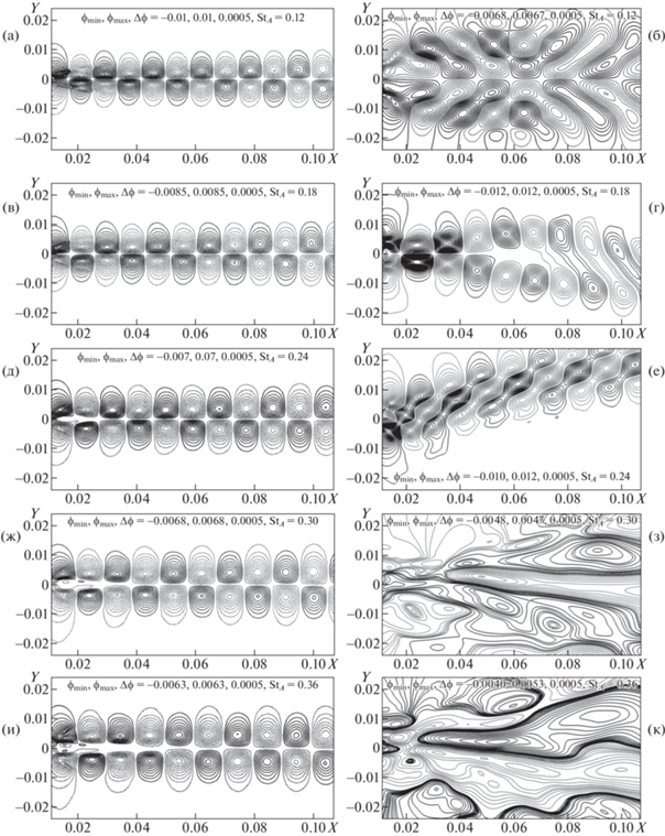 Когерентные структуры за профилем, совершающим угловые колебания, являются более компактными и концентрированными (рис. 17а), тогда как за вертикально колеблющимся профилем они более разбросаны (рис. 17б). Такое разбросанное расположение связано с более интенсивным переносом энергии от вертикально колеблющегося профиля к потоку жидкости. Когерентные структуры за профилем, совершающим угловые колебания, раздвигаются с увеличением $S{{t}_{A}}$ (рис. 17в, д, ж, и). Однако они не проявляют никакой тенденции к апериодичности. Когерентные структуры за профилем, совершающим вертикальные колебания, отклоняются (рис. 17г) вместе с отклонением следа. Но моды, обладающие более низкими энергиями (не представлены здесь), не испытывают отклонения, т.е. рост $S{{t}_{A}}$ не оказывает на них влияния. Это означает, что отклоненное среднее течение само обладает структурами, чьи характеристики полностью отличны от характеристик среднего течения [43]. Дальнейшее увеличение $S{{t}_{A}}$ до $0.24$ приводит к отклонению в высоко энергетических модах (рис. 17е), так же как низко энергетические моды и все СОР моды ответственны за характер среднего течения. При $S{{t}_{A}} = 0.30$ апериодичность, развивающаяся в потоке, начинает влиять на эволюцию когерентных структур (рис. 17з, к). Структуры в поле течения подвергаются случайным возмущениям и становятся полностью непредсказуемыми. Для краткости когерентные структуры за машущим крылом здесь не представлены. Качественно они подобны структурам в следе и указывают на периодичность в течении.
