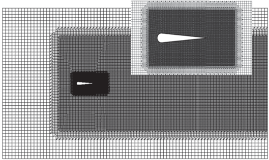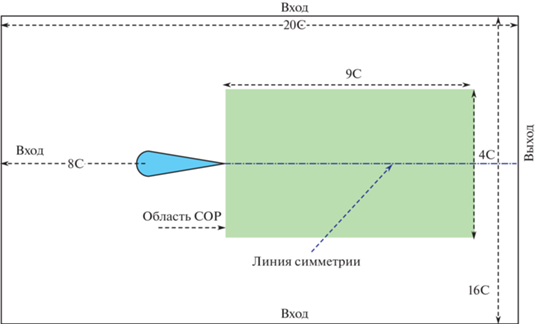 Расчетная область, использованная в настоящей работе, изображена на рис. 2. Размеры расчетной области достаточно велики, чтобы исключить влияние границ на решение. Левая, верхняя и нижняя границы располагаются на растоянии $8C$ от профиля. Задняя граница находится на расстоянии 12C от профиля. Левая, верхняя и нижняя границы расчетной области являются входными, а правая граница – выходная. На входной границе градиент давления задается нулевым, а скорость постоянной. На выходной границе задается атмосферное давление при нулевом градиенте скорости. Профиль рассматривается как движущаяся стенка, на которой ставятся условия прилипания. Расчетная сетка, показанная на рис. 3, имеет сгущения вблизи профиля для правильного определения процессов в пограничном слое. Сетка имеет несколько уровней сгущения, так что максимальный объем ячейки сетки имеет место у дальней границы, а минимальный объем достигается вблизи профиля. Соответственно, минимальный (у профиля) и максимальный (у дальней границы) объемы сочной ячейки равны $1.5 \times {{10}^{{ - 13}}}$ и $4.1 \times {{10}^{{ - 9}}}$. Максимальная неортогональность сетки равна 50.43 со средним по сетке значением 3.14. Максимальная скошенность сетки ограничена значением 0.71. Внутри расчетной области выбрана область размерами $9C \times 4C$, в которой выполняется собственно ортогональное разложение.