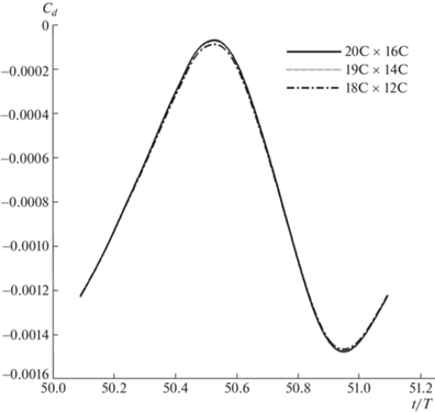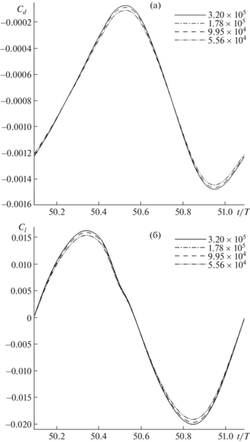 Размеры расчетной области выбраны согласно работам [30, 31], в которых исследовался случай двумерного машущего профиля. Для профиля, совершающего смешанные колебания, исследовалось влияние размеров расчетной области, которые варьировались в продольном и поперечном направлениях. Расстояния от профиля до выходной границы и до верхней и нижней границ увеличивались на расстояние порядка одной длины хорды. Расстояние от профиля до входной границы оставалось неизменным. Зависимость коэффициента сопротивления от времени, рассчитанная в областях размерами $20C \times 16C$ и $19C \times 14C$, оказывается весьма близкой (рис. 4). Для профиля, совершающего смешанные колебания, исследовалось также влияние размеров сетки на решение. Количество узлов сетки в расчетной области увеличивалось, чтобы получить сетки с четырьмя различными плотностями узлов. Для каждого из этих случаев изучались зависимости от времени коэффициента сопротивления ${{C}_{d}}$ и коэффициента подъемной силы ${{C}_{l}}$ в течение одного полного цикла. Различные плотности сетки достигались сгущением ее узлов вблизи профиля. На рис. 5а и 5б представлены зависимости от времени коэффициентов сопротивления $\left( {{{C}_{d}}} \right)$ и подъемной силы $\left( {{{C}_{l}}} \right)$, полученные на различных сетках. Сделан вывод, что сетки с $3.2 \times {{10}^{5}}$ ячеек в расчетной области достаточно, чтобы уловить особенности течения вблизи профиля. Для оценки зависимости решения в следе от параметров сетки было рассмотрено поведение средней скорости течения ${{U}_{{mean}}}$. Распределения ${{U}_{{mean}}}$ вдоль линии симметрии и перпендикулярно ей построены на рис. 6. Вдоль линии симметрии профиль ${{U}_{{mean}}}$ построен до расстояния $8C$ (рис. 6а), а распределение в перпендикулярном направлении построено на расстоянии $8C$ от задней кромки профиля (рис. 6б). Распределения ${{U}_{{mean}}}$ практически не отличаются друг от друга в расчетах на последовательных сетках с $3.2 \times {{10}^{5}}$ и $1.78 \times {{10}^{5}}$ ячейками. Для дальнейших расчетов была выбрана сетка с $3.20 \times {{10}^{5}}$ ячейками.