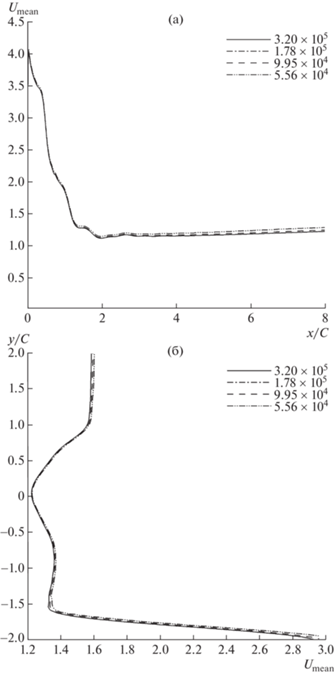 Зависимость средней скорости $\left( {{{U}_{{mean}}}} \right)$ от расстояния вдоль линии симметрии (а) и перпендикулярно линии симметрии при x = 8C (б) при различных размерах сетки.