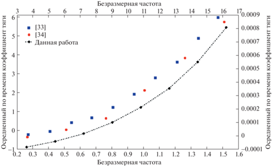 Количественная валидация численных решений представлена на рис. 9. Зависимость осредненного по времени коэффициента тяги $\left( {\overline {{{C}_{t}}} } \right)$ от безразмерной частоты махания $\left( {f{\text{*}} = \frac{{f \times C}}{U}} \right)$, полученная в настоящих расчетах, сравнивается с экспериментальными измерениями работ [33, 34]. Диапазон частот и значение числа Рейнольдса, рассмотренные в данной работе, отличаются от представленных в упомянутых экспериментальных исследованиях. Поэтому при сравнении экспериментальных и численных результатов для них используются различные масштабы. Масштабы для экспериментальных результатов нанесены на левой и нижней осях рисунка, а для численных результатов – на правой и верхней осях. Измеренные и рассчитанные коэффициенты тяги обнаруживают одну и ту же тенденцию при увеличении частоты маханий.