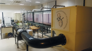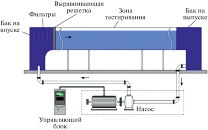 Основные компоненты гидроканала изображены на рис. 2. Таким образом, система состоит из панели управления, которая контролирует электромоторы, подсоединенные к гидроканалу, входной и выходной накопительных емкостей и тестовой камеры.