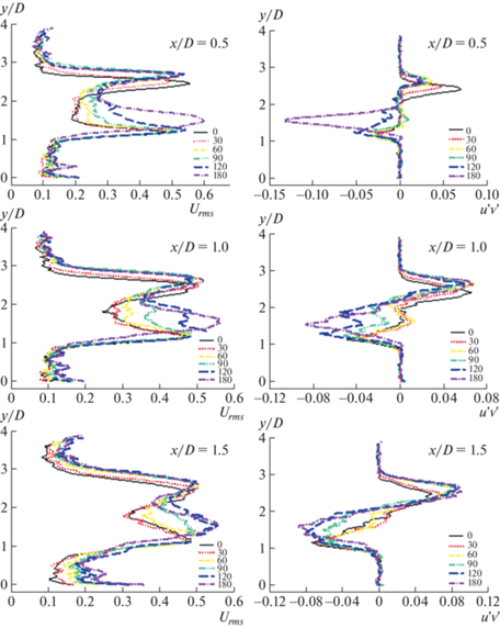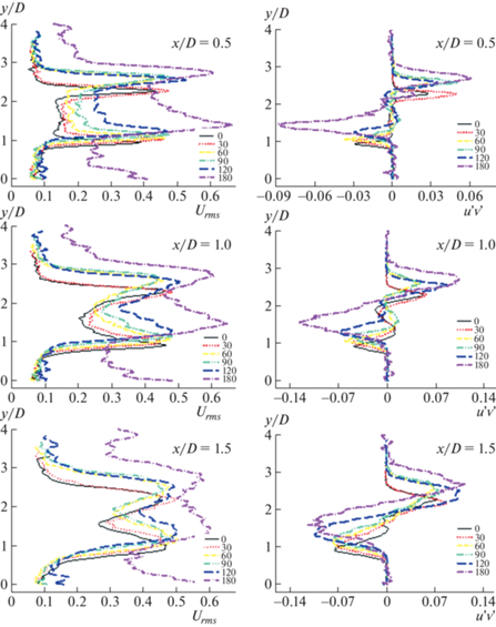 $k = \frac{1}{2}[\overline {u{\kern 1pt} '{\kern 1pt} u{\kern 1pt} '} + \overline {{v}{\kern 1pt} '{\kern 1pt} {v}{\kern 1pt} '} ].$Полученные значения кинетической энергии турбулентности k были обезразмерены с помощью 0.41 значения скорости набегающего потока, которое использовалось при вычислении Re = 10 000. Графики были также построены для зависимостей от безразмерного расстояния x/D. Положение x/D = 0.5 было выбрано случайно, чтобы исследовать развитие статистических характеристик турбулентности непосредственно за цилиндром. Безразмерное положение x/D = 1 выбрано для вертикальных фокальных точек и безразмерное положение x/D = 1.5 определяется приближенно для положения седловой точки. Значения Urms и k вначале возрастают при увеличении расстояния по обе стороны цилиндра x/D = 0.5 и затем, после достижения локальных максимумов в сдвиговом слое, убывают. Однако при x/D = 0.5 появляются размеры, на которых локальные максимумы значительно уменьшаются. Более того, графики кинетической энергии турбулентности k имеют относительно слабый вторичный локальный максимум в окрестности граничной линии циркуляции соответствующей линии тока. Расстояние между локальными максимумами кинетической энергии турбулентности k по обе стороны убывает по мере того, как линия тока становится длиннее при росте расстояния вниз по течению. По обе стороны точки максимумов на графиках Urms, Vrms и кинетической энергии турбулентности k сближаются друг с другом при увеличении расстояния вдоль по потоку. При исследовании графиков зависимостей для напряжений Рейнольдса можно видеть, что безразмерное расстояние x/D возрастает, это демонстрирует синусоидальное распределение. Эти два локальных максимума имеют место непосредственно выше и ниже циркуляционной линии тока вблизи перехода поверхности цилиндра от вертикального положения к более наклонному. Все полученные результаты изображены на рис. 10–15.