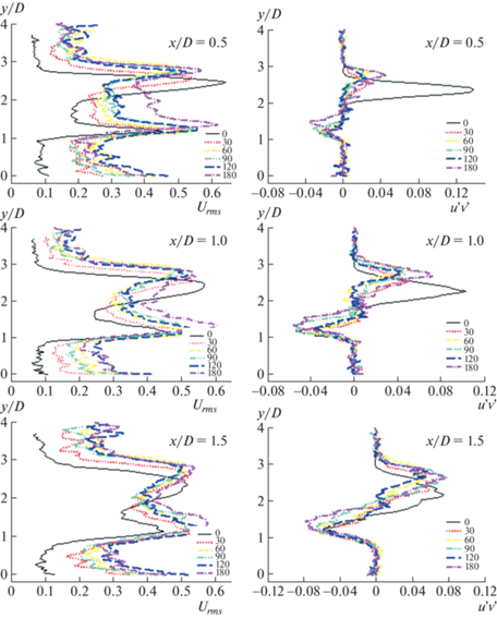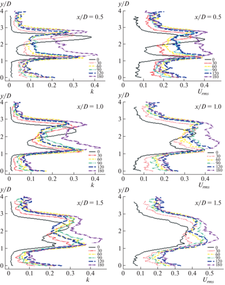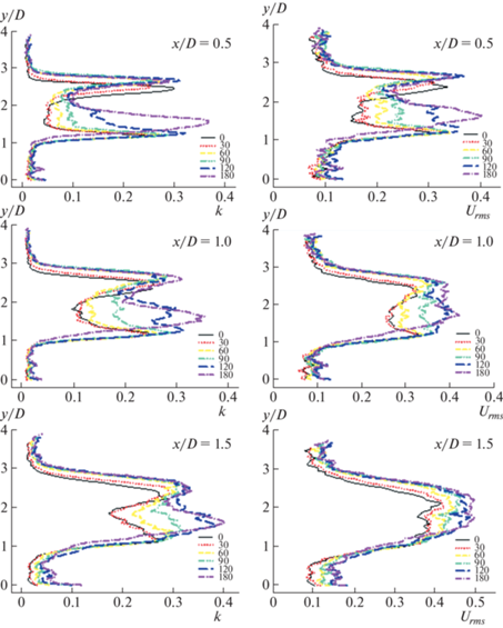 В этом разделе рассматриваются состояния течения при различных положениях, эти состояния включают кинетическую энергию турбулентности, среднеквадратические значения продольной и поперечной компонент скорости Urms и Vrms и зависимости для сдвиговых напряжений Рейнольдса u’v' для всех θ (0, 30, 60, 90, 120 и 180°). В согласии с характером использованной системы PIV-измерений скорости по изображениям частиц в настоящем исследовании рассмотрено только двумерное поле течения, так что полное трехмерное определение кинетической энергии турбулентности k было упрощено в соответствии с выражением (3.1)