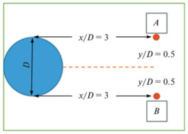 Спектральная функция скорости была исследована в точках поля течения, показанных на рис. 16 для того, чтобы определить частоту схода вихрей Кармана f и нерегулярностей в сдвиговом слое. Прежде всего были заданы две точки на каждой стороне цилиндра, обозначенные A и B, с целью определения доминирующих частот. Точка A была задана на безразмерном расстоянии от оси x, равном 3, и безразмерном расстоянии от оси y, равном 0.5, в единицах диаметра цилиндра и координаты точки B были заданы в виде x/D = 3 и y/D = 0.5, симметрично точке A относительно центральной линии цилиндра.