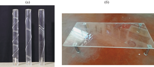Модели цилиндров, использованных в экспериментах, изображены на рис. 3. Всего использовалось 4 экспериментальные модели, три модели имели одно-, двух- и четырехвитковые спиральные выступы (накладки), а четвертая представляла собой прямой цилиндр. Структуры выступов в виде одного витка (p = 440 мм), двух витков (p = 220 мм) и четырех витков (p = 110 мм) были сформированы за счет изменения числа шагов p полукругов на поверхности цилиндра. Модели были изготовлены из оргстекла. Тестовые цилиндры были изготовлены посредством обработки плексигласовых трубок диаметром 50 мм с помощью высокоточного фрезерного станка с числовым программным управлением (ЧПУ). Отношение длины цилиндра к его диаметру L/D и отношение D/d диаметров цилиндра и полуцилиндрической спиральной “навивки” (спиральной “обмотки”) на поверхности цилиндра были обработаны так, чтобы они равнялись 10. Длина основного цилиндра была ограничена 440 мм, чтобы избежать ухудшения структуры материала при обработке. Эксперименты выполнялись на платформе, помещенной в гидроканал. Платформа изображена на рис. 3. Длина платформы 1500 мм, а ее ширина 700 мм, высота расположения платформы, отсчитываемая от дна канала, равна 220 мм и расстояние между платформой и поверхностью воды составляет 600 мм. Эксперименты были проведены с установкой тестовых цилиндров на эту платформу. Число Рейнольдса, вычисленное по диаметру основного цилиндра и скорости набегающего потока в канале, равнялось 10 000. Для исследования влияния угловой позиции спиральной “навивки” (“обмотки”) эксперименты были выполнены при угловом положении спирального выступа θ = 0, 30, 60, 90, 120 и 180° относительно точки торможения потока на цилиндре. Во время экспериментов были сделаны 1000 моментальных фотографий при каждом угловом положении. Векторы скорости были рассчитаны обработкой полученных изображений. Характеристики течения были определены при использовании этих данных.