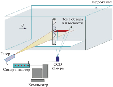 На рис. 4 приведена схема системы измерений скорости по изображениям частиц. Во время получения изображений поле течения освещалось двухимпульсным Nd:Yag лазером на алюмоиттриевом гранате, легированном неодимом, в плоскости, перпендикулярной потоку. Во всех измерениях временной интервал между двумя лазерными импульсами задавался равным 83 мс. В поток воды были добавлены частицы диаметром 10 мк, так что на каждое изображение приходилось минимум 50 частиц. Движение этих частиц регистрировали видеокамеры на основе устройства с зарядовой связью (CCD камера). Записанные изображения обрабатывались с помощью пакета программ Dantec Flow Manager.
