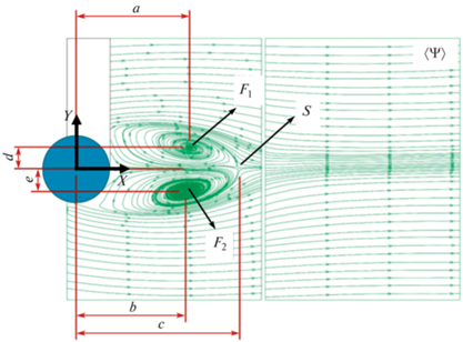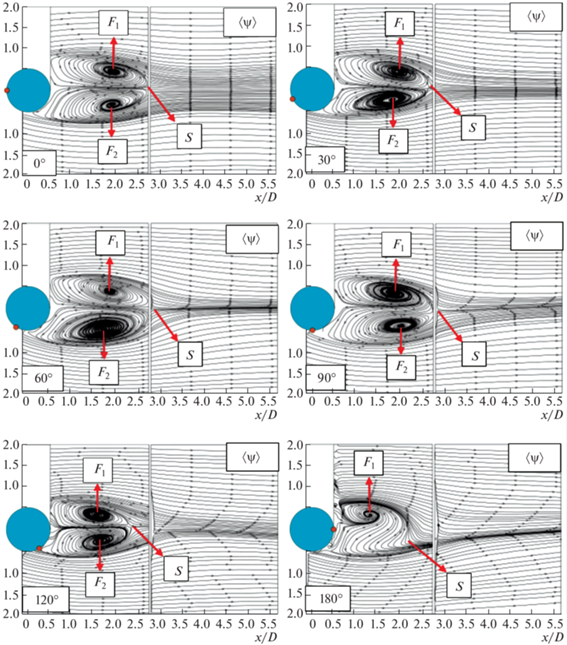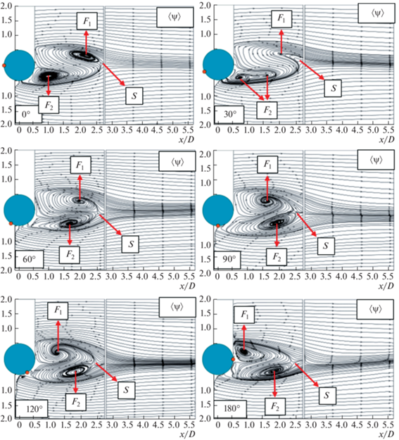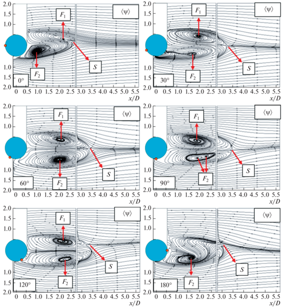 Структура усредненного по времени обтекания прямого цилиндра без накладок симметрична относительно оси X [17, 18]. Картины усредненных по времени линий тока ψ указывают на то, что в области следа за круговым цилиндром формируются два фокуса (F1 и F2) с противоположными направлениями вращения. Эта зона циркуляции ограничена набегающим свободным течением, которое покидает седловую точку S вниз по потоку от рассматриваемого поля течения. Полученные наблюдения находятся в согласии с данными исследований [19–21].