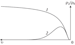 Качественный график функции ${{\rho }_{2}}{\text{/}}{{\rho }_{0}}$ для случаев ($\lambda = 0$, $\alpha = 1$) – кривая 1 и ($\lambda = 1$, $\alpha = 1$) – кривая 2.