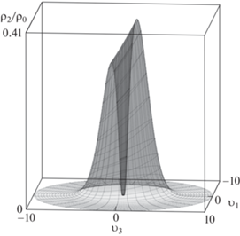 При $\alpha > 0$ вблизи центра имеется полость, характерные графики решения приведены на рис. 2. Если $\lambda = 0$ функция ${{\rho }_{2}}({v})$ монотонно выходит на значение ${{\rho }_{0}}$ при стремлении ${\text{|}}{v}{\text{|}}$ к бесконечности, при $\lambda > 0$ – стремится к 0. Кроме того, в последней ситуации существует максимум плотности в точке