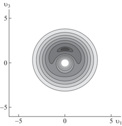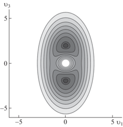 ${{\rho }_{2}}({{{v}}_{i}}) = {{\rho }_{0}}\exp \left( { - \frac{{\lambda {\text{|}}{\mathbf{v}}{{{\text{|}}}^{2}}}}{6} - \frac{\alpha }{{{\text{|}}{\mathbf{v}}{\text{|}}}} + {{\delta }_{1}}{{{v}}_{3}}} \right)$На рис. 3 приведена форма распределения плотности, как функции $({{{v}}_{1}},{{{v}}_{3}})$, при $\lambda = 1$, $\alpha = 1$ и ${{\delta }_{1}} = 0.1$. На рис. 4 указаны линии уровня объемной фигуры, приведенной на рис. 3. В результате сжатия при $t \to - 0$ значение функции $\rho = {\text{|}}t{{{\text{|}}}^{{ - 3}}}{{\rho }_{2}}({{{v}}_{i}})$ будет увеличиваться, что можно интерпретировать как движение неоднородности плотности к центру, своего вида осесимметричная струйка.