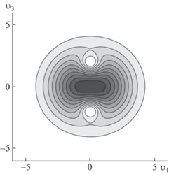 ${{\rho }_{2}}({{{v}}_{i}}) = {{\rho }_{0}}\exp \left( { - \frac{{\lambda {\text{|}}{\mathbf{v}}{{{\text{|}}}^{2}}}}{6} - \frac{\alpha }{{{\text{|}}{\mathbf{v}}{\text{|}}}} + {{\delta }_{2}}[3{v}_{3}^{2}\, - \,{\text{|}}{\mathbf{v}}{{{\text{|}}}^{2}}]} \right)$На рис. 5 приведена форма распределения плотности при $\lambda = 1$, $\alpha = 1$ и ${{\delta }_{2}} = 0.05$. На рис. 6 указаны линии уровня данной фигуры. Здесь будут две симметричные струйки, направленные к центру.