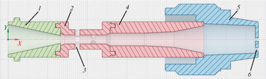 В настоящий момент процесс проектирования таких устройств (решение прямой задачи) требует проведения дополнительных экспериментальных исследований. Это обусловлено сложной физикой протекающих при данном режиме диспергирования двухфазного потока процессах. Несмотря на то что в последние годы увеличилось количество научных публикаций на эту тему, до сих пор нет работ, которые позволили бы обобщить достижения в этой области [1]. В данной работе рассматривается смеситель, формирующий двухфазный газожидкостный поток необходимой пузырьковой структуры, имеющий конструкцию, представленную на рис. 1.