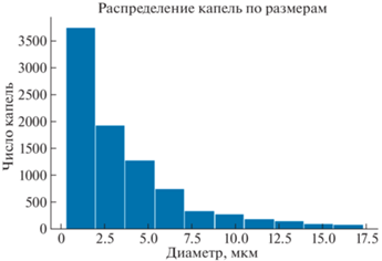 Исследование потока теневым методом производилось в области перехода от первичного распада к вторичному. Дробление жидкой фазы имеет две зоны формирования капельной структуры: первая зона, примыкающая к выходному сечению форсунки, формирует капли, соответствующие распылу однофазной жидкости при параметрах перед форсункой, вторая зона расположена на расстоянии от 20 до 100 калибров диаметра отверстий. Поскольку скорость газа, вытекающего из форсунки, существенно больше скорости жидкости (при одинаковом давлении перед форсункой), то реализуется вторичное дробление капель. Пример получаемого распределения приведен на рис. 2, в виде зависимости от числа капель, относящихся к данному диапазону размеров (фракции капель).