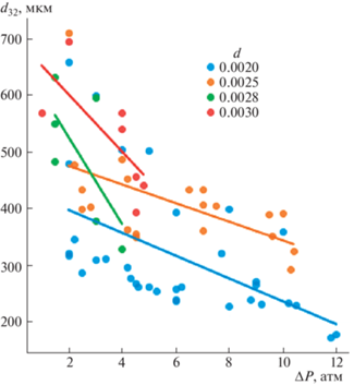 Далее для каждого распределения был найден средний диаметр Заутера и построены его зависимости от основных параметров форсунки, показанные на рис. 3, 4. Для качественной оценки и сравнения результатов работы форсунок на графиках использовалась линейная аппроксимация.