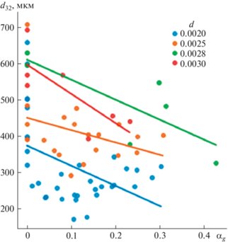 Зависимость диаметра Заутера от объемной доли воздуха перед форсунками, диаметры отверстий которых указаны в легенде d, м.