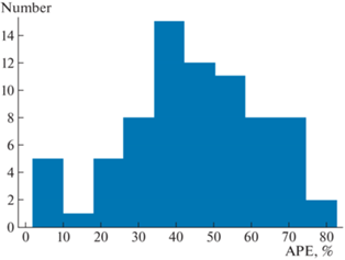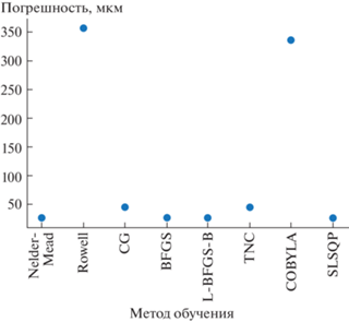 ${\text{MAPE}} = \frac{1}{n}\sum\limits_{i = 1}^n {\left| {\frac{{{{A}_{i}} - {{F}_{i}}}}{{{{A}_{i}}}}} \right|} $Ввиду неудовлетворительного значения MAPE “переобучим” модель на полученных экспериментальных данных. На рис. 6 представлена зависимость абсолютной погрешности модели от метода обучения. Nelder-Mead – метод деформируемого многогранника [7], Powell – метод Пауэлла или метод сопряженных направлений [8], CG – метод сопряженных градиентов (метод Флетчера–Ривcа) [9], BFGS – алгоритм Бройдена–Флетчера–Гольдфарба–Шанно [10], L-BFGS-B – модификация с ограниченным использованием памяти в многомерном кубе [11], TNC – усеченные методы Ньютона (Truncated Newton methods) [12], COBYLA – ограниченная оптимизация с линейной аппроксимацией [12], SLSQP – последовательное квадратичное программирование [13].