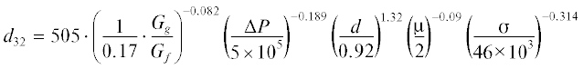 ${{d}_{{32}}}_{{\left( {y \to 0} \right)}} = 0.000505{{\left( {\frac{1}{{0.12}} \cdot \frac{{Gg}}{{{{G}_{f}}}}} \right)}^{{ - 0.4686}}}{{\left( {\frac{{\Delta P}}{{5 \times {{{10}}^{6}}}}} \right)}^{{ - 0.1805}}}{{\left( {\frac{d}{{0.2}}} \right)}^{{0.6675}}}{{\left( {\frac{{{\mu }}}{{{\text{0}}{\text{.2}}}}} \right)}^{{0.1714}}}{{\left( {\frac{{{\sigma }}}{{{\text{46}}}}} \right)}^{{0.1382}}}$(3)