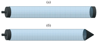 Исследования проведены на экспериментальной установке TV51075, которая представляет собой виброгенератор S511 с усилителем мощности марки ВАA 120 фирмы TIRA [28]. На столе вибростенда при помощи специальной системы устанавливался плоский поршень из легкого прочного сплава Д16Т, который колебался в цилиндре соединенного с прозрачной, вертикально ориентированной, стеклянной трубой радиусом R = 0.018 м. Радиус трубы равен радиусу поршня и цилиндра. Противоположный конец трубы герметично закрывался плоской крышкой, расположенной перпендикулярно оси трубы (однородная труба), или крышкой в виде полого симметричного конуса с радиусом основания, равным радиусу трубы (труба с конусной насадкой). Геометрия исследуемых резонаторов представлена на рис. 1. Длина однородной трубы Lt = 0.51 м (рис. 1а), длина трубы с конусной насадкой (рис. 1б) состоит из длины цилиндрической части l = 0.498 м и конуса с высотой d = 0.036 м; следовательно, расстояние от поршня до вершины конуса составляет Lc = l + d = 0.534 м. Для указанных геометрических параметров трубы с конусной насадкой системой-аналогом является однородная труба с приведенной длиной [3, 29], определяемой выражением, выведенным из равенства объемов