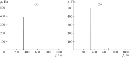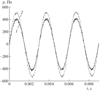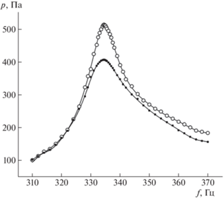 На рис. 2, 3 представлены амплитудно-частотные характеристики (АЧХ) и осциллограммы колебаний давления газа для однородной трубы и трубы с конусной насадкой при амплитуде смещения поршня l0 = 0.05 мм. Амплитуда колебаний давления максимальна на резонансной частоте ft = fc = 334.5 Гц, одинаковой для обоих случаев в силу равенства объемов резонаторов. Наблюдается несимметричный вид зависимостей p(f) относительно резонансной частоты. В первом случае амплитуда колебаний давления на резонансной частоте pmax = 406.5 Па, во втором 512.4 Па. Измеренные значения интерполированы полиномиальными зависимостями типа