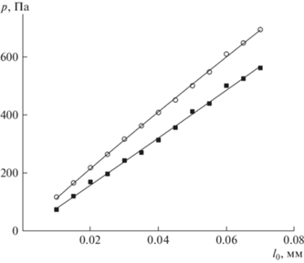 Зависимость давления p от амплитуды смещения поршня l0 на резонансной частоте колебаний газа: ■ – однородная труба; ○ – труба с конусной насадкой; линии – степенная аппроксимация.