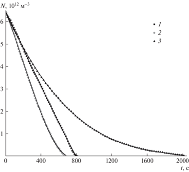 Зависимости концентрации частиц аэрозоля от времени в однородной трубе (1), в трубе с конусом (2) и при естественном осаждении (3) при амплитуде смещения поршня l0 = 0.05 мм. Линии – полиномиальная аппроксимация.