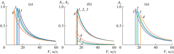 Зависимости безразмерных коэффициентов волновых сил ${{A}_{1}}$, ${{A}_{2}}$ от скорости движения нагрузки при $\bar {Q} = 0$: (а–в) – $\psi = 0$, $\pi {\text{/}}2$, $\pi $; 1–4 – $S = 0$, 0.3, 0.5, 1.