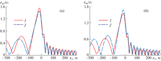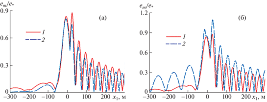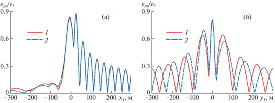 Зависимости от координаты ${{x}_{1}}$ при ${{y}_{1}} = 0$ (а) и от координаты ${{y}_{1}}$ при ${{x}_{1}} = 0$ (б) максимальных деформаций ледяного покрова ${{e}_{m}}{\text{/}}e_{*}^{{}}$ при $\bar {Q} = 0$, $V = 20$ м/с, $\psi = \pi {\text{/}}2$: 1–2 – $S = 0$, 0.4.