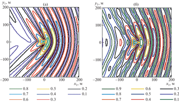 Наибольшие деформации происходят под областью нагрузки. На рис. 6 представлены изолинии максимальных деформаций ${{e}_{m}}{\text{/}}e_{*}^{{}}$ при $\bar {Q} = 0$, $V = 20$ м/с, $S = 0.4$, $\psi = \pi {\text{/}}2$ (а) и $\psi = \pi $. В обоих случаях амплитуды волн деформации перед нагрузкой значительно больше, чем в других направлениях.