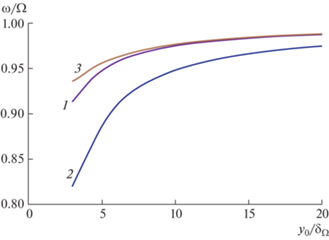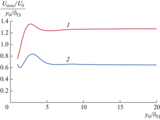 Графики рис. 3 показывают, что в диапазоне 5 ≤ y0/δ ≤ 20 скорости Umax/U0 пропорциональны относительным поперечным размерам резонаторов y0/δΩ. Эти значения приближенно могут быть оценены по следующим формулам: для трубы-резонатора $\frac{{{{U}_{{\max }}}}}{{{{U}_{0}}}} \approx 0.64\frac{{{{y}_{0}}}}{{{{\delta }_{\Omega }}}}$; для плоского резонатора $\frac{{{{U}_{{\max }}}}}{{{{U}_{0}}}} \approx 1.26\frac{{{{y}_{0}}}}{{{{\delta }_{\Omega }}}}$. Максимальная амплитуда продольной скорости газа в плоском резонаторе шириной 2y0 примерно в два раза больше, чем в трубе диметром 2y0.