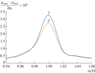 Графики полностью совпадают вне резонанса в областях [0.94, 0.98] и [1.02, 1.06], хорошо согласуются около резонанса ([0.98, 0.99] и [1.01, 1.02]). В резонансе ω/Ω = 1 значения безразмерной амплитуды давления $\frac{{{{p}_{{\max }}} - {{p}_{{\min }}}}}{{2{{p}_{0}}}}$ максимальны и примерно равны 0.03.