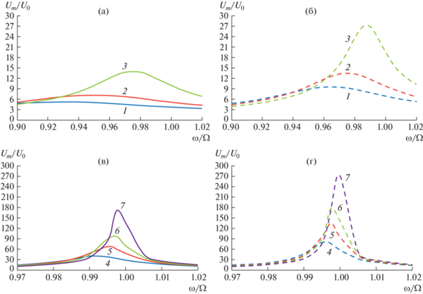 Максимальные амплитуды продольной скорости газа вблизи фундаментальной частоты. a и в – цилиндрический резонатор, б и г – плоский двумерный резонатор. 1 – y0/δ = 7, 2 – y0/δ = 10, 3 – y0/δ = 20, 4 – y0/δ = = 60, 5 – y0/δ = 100, 6 – y0/δ = 150, 7 – y0/δ = 300.