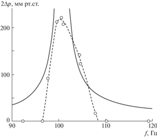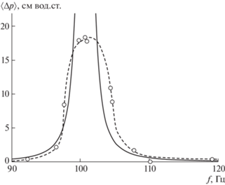 На рис. 6 изображены резонансные кривые максимального размаха давления ∆p = p – p0 на закрытом конце трубы-резонатора, посчитанные аналитически и экспериментально. В работе [4] изучались ударные волны, которые возникают вблизи резонансной частоты, поэтому вне резонансных частот (где ударные волны не возникают) размах давления принимался равным нулю. Графики удовлетворительно согласуются на субрезонасных частотах.