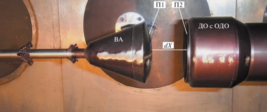 Общий вид модели, расположение датчиков пульсаций давления П1 (на днище ВА) и П2 (на верхнем экране ДО). ВА – возвращаемый аппарат, ОДО – обтекатель двигательного отсека, dX – расстояние разделения ВА и ОДО.