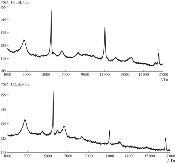 Измерения нестационарных давлений на поверхности модели проводились посредством малогабаритных преобразователей давления с собственной частотой более 200 кГц. Один датчик пульсаций давления (точка П1) располагался на периферии днища ВА, другой – точка П2 – на верхнем торце ДО напротив П1. Для повышения точности определения характеристик пульсаций давления, включая корреляционные, длительность эксперимента при постоянных условиях составляла не менее 10 с.